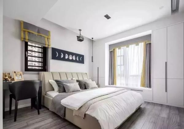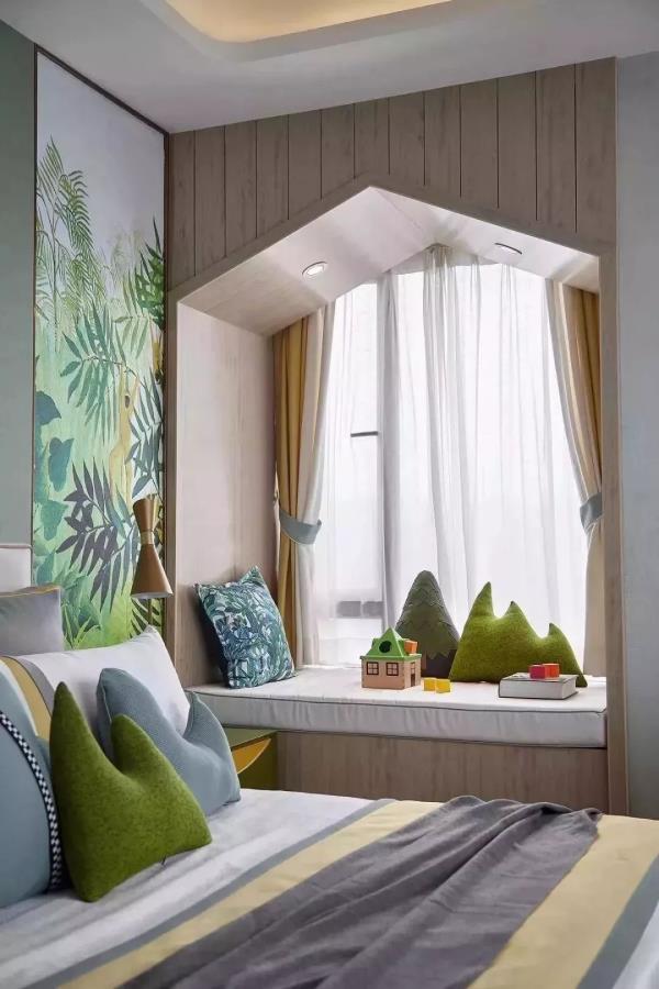 异型飘窗想要装得好看,但又不那么复杂麻烦,其中最简单的方法就是窗帘外装(靠近窗户),这样装不但比较省空间、显得不拥挤,而且还能提升空间的整体氛围。